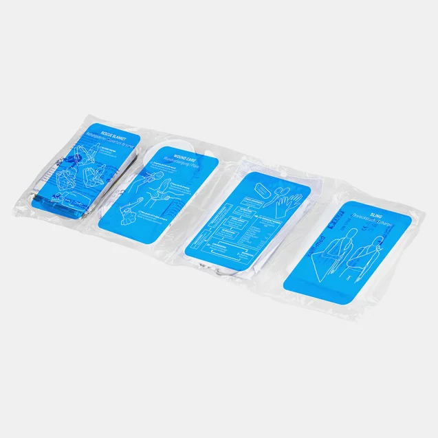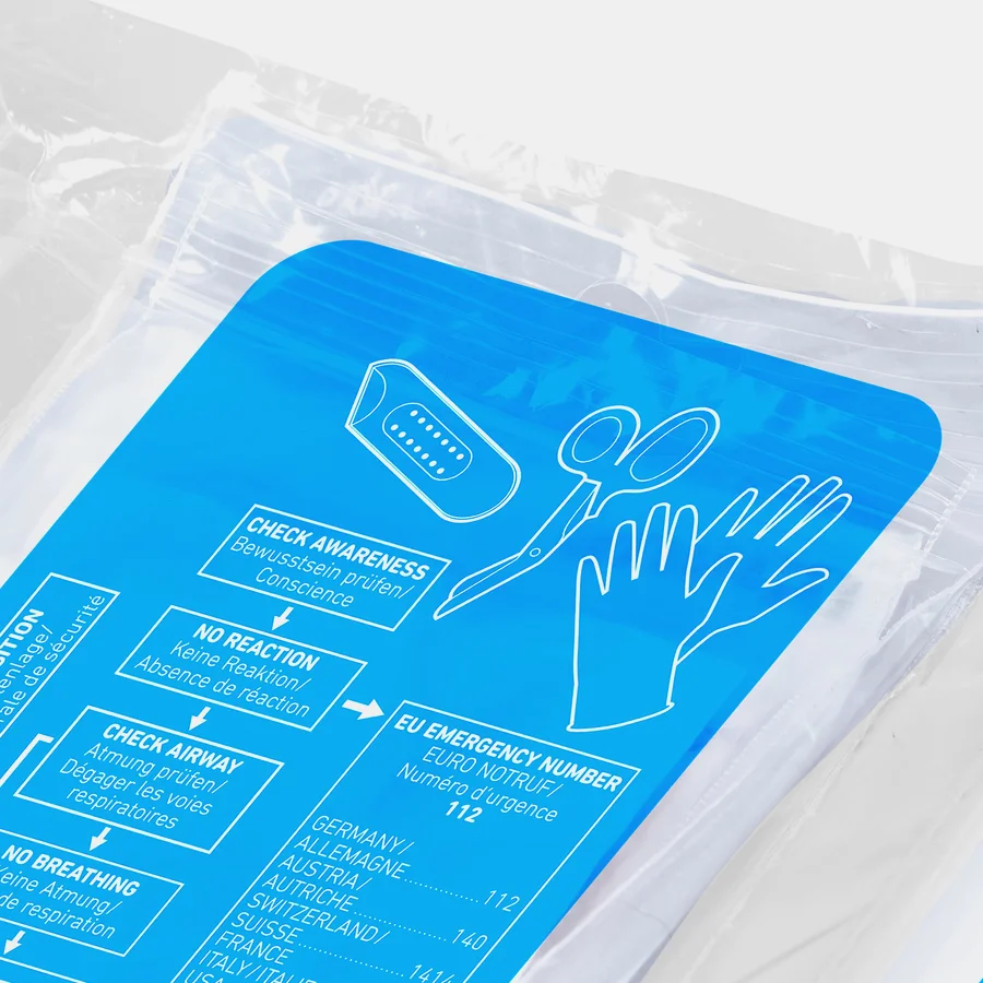 Das kompakte Erste-Hilfe-Set ist vollständig wasserdicht und hält somit jedem Wetter stand. Der praktische Rolltop ermöglicht einen schnellen Zugriff auf den Inhalt. Zudem bleibt genügend Platz für zusätzlichen Eigenbedarf. Die Inhalte des Sets sind übersichtlich in insgesamt vier Kammern aufgeteilt. Zusätzlich informieren Illustrationen und Beschriftungen über den jeweiligen Inhalt und geben wichtige Versorgungstipps.