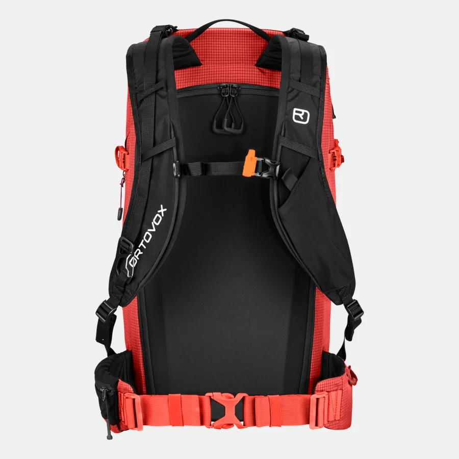 Besonders praktisch: der schnelle Zugriff auf die Ausrüstung. Ohne, dass der Rucksack abgenommen werden muss, kann schnell und einfach auf die Schulter- und Hüfttasche, das Seitenfach für Steigeisen, Felle und Harscheisen sowie das Seil zugegriffen werden. Ebenfalls lassen sich während des Tragens, die Ski mit einem Karabiner parallel zum Rucksack befestigen.